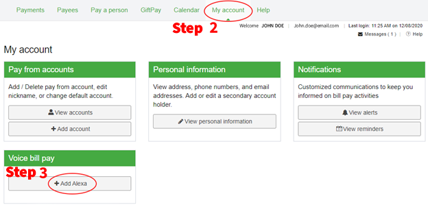 First, you’ll need to add Alexa to your Bill Pay account within Online Banking. Here’s how: